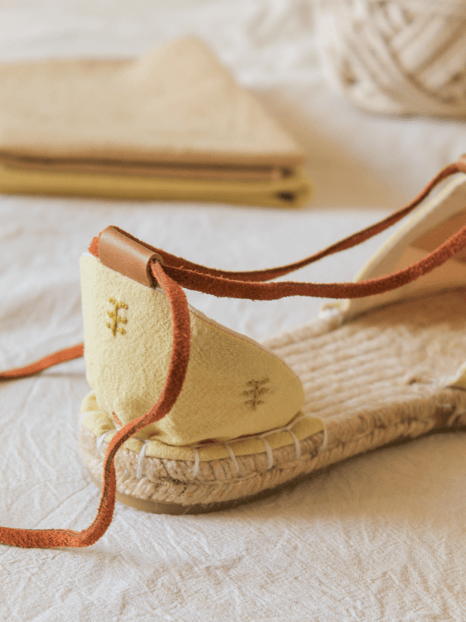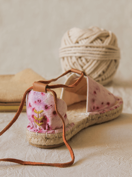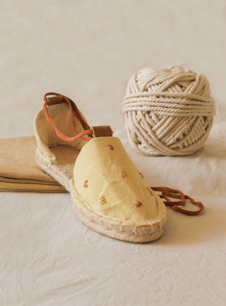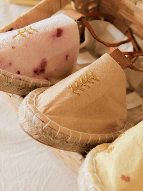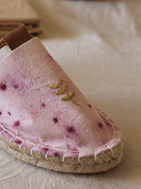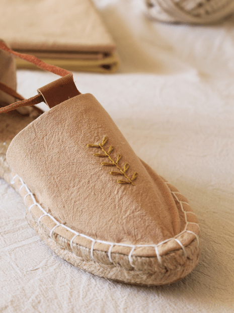 Las alpargatas "Bosque árido" representan al tamarugo, al pimiento y algarrobo, presentes en la pampa del norte de Chile, con bordados a mano y tintes del altiplano 🌵 un trabajo 100% artesanal.