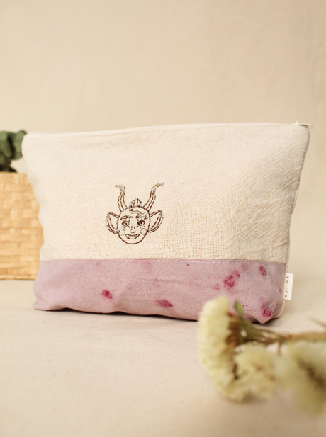 Estuche con forro y fuelle pequeño. Bordado figurín Diabla suelta , tela de algodón, teñido con tinte natural de choclo morado, tinte característico de la zona norte de chile.