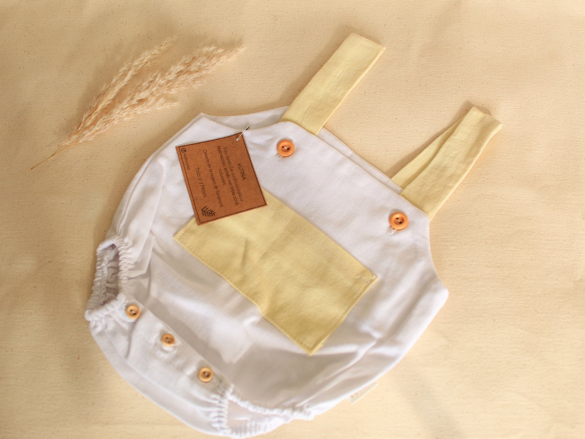 Ranitas estilo jardineras para bebés, bolsillo y tirantes teñidas con tinte natural de Siputola.