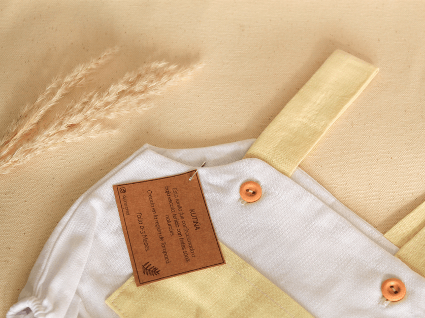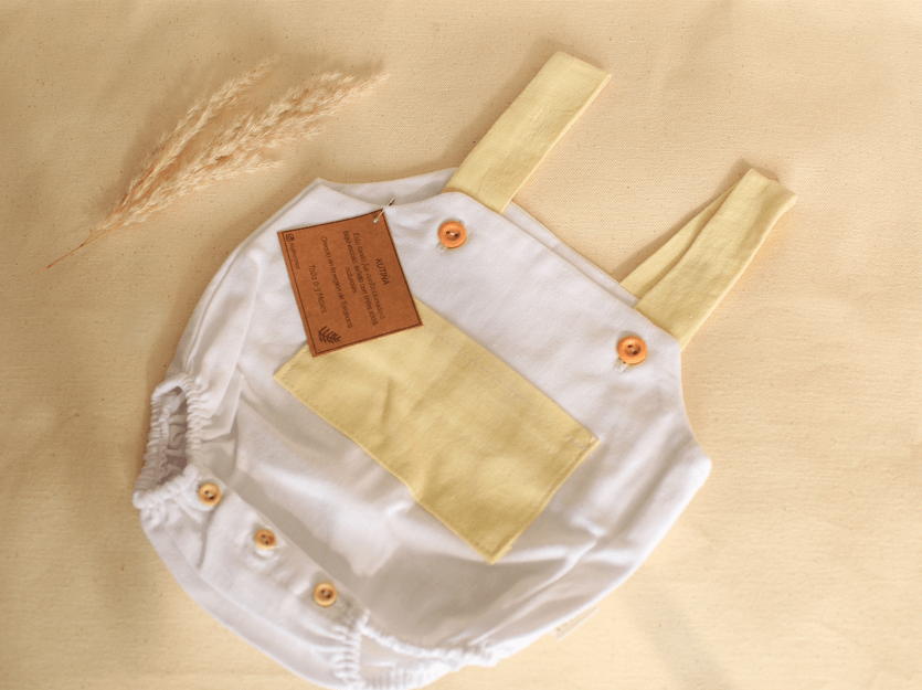 Ranitas estilo jardineras para bebés, bolsillo y tirantes teñidas con tinte natural de tola.