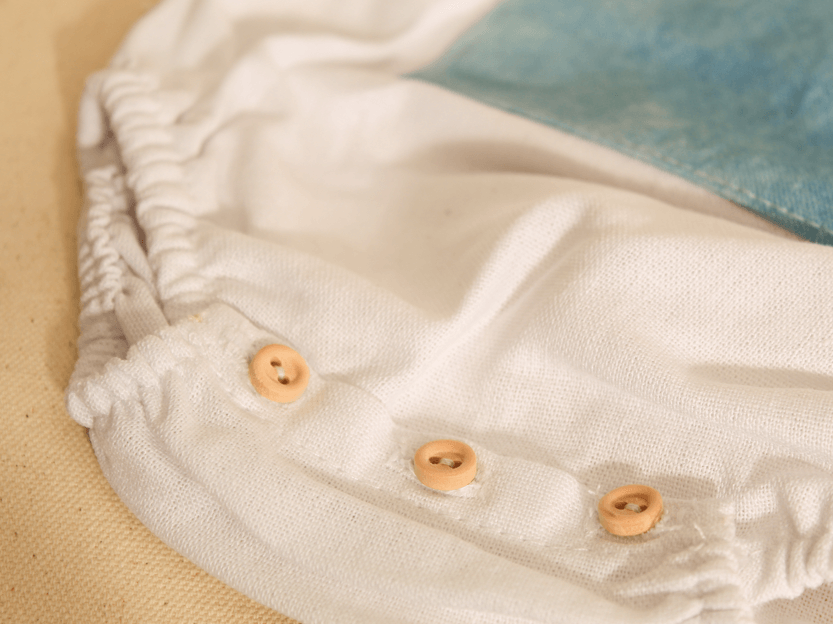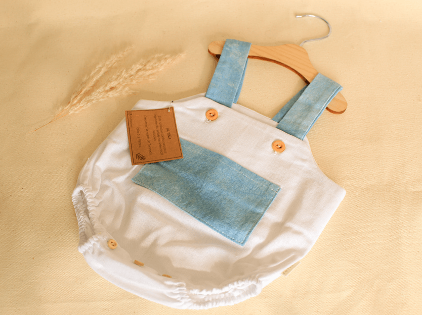 Ranitas estilo jardineras para bebés, bolsillo y tirantes teñidas con tinte natural de índigo.