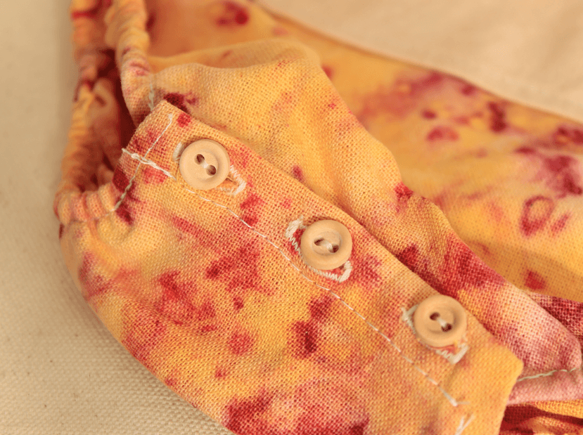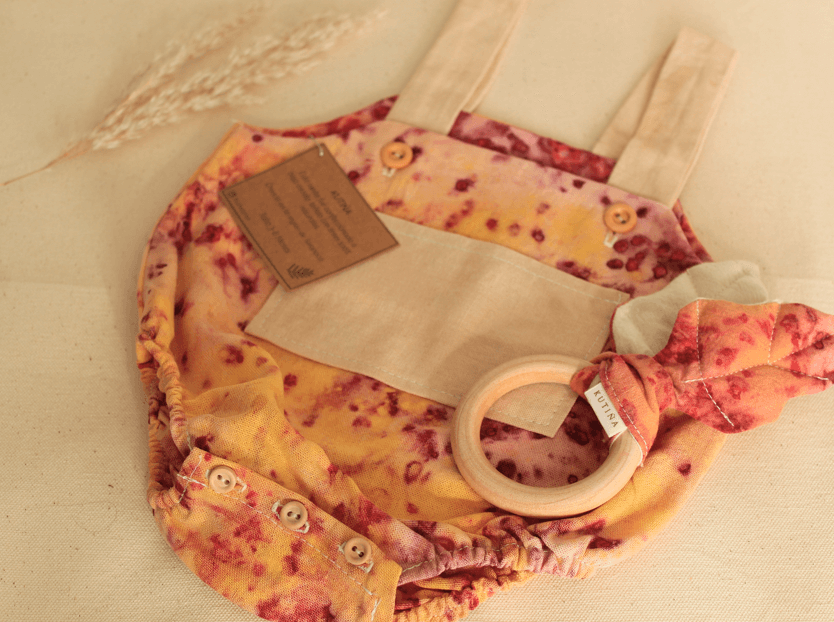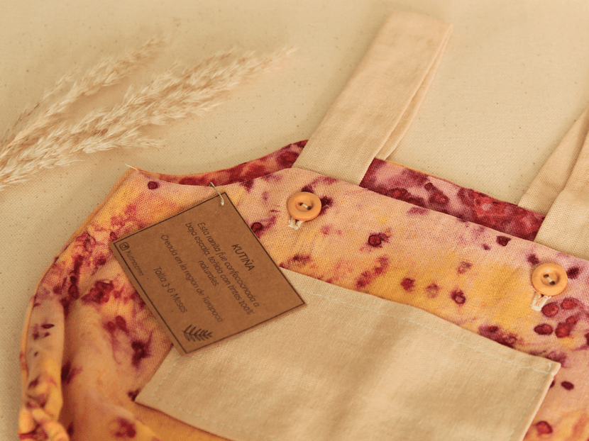 Ranitas estilo jardineras para bebés, tinte de cúrcuma y cochinilla. tirantes teñidos con queñoa, tinte ancestral de la región de tarapacá.