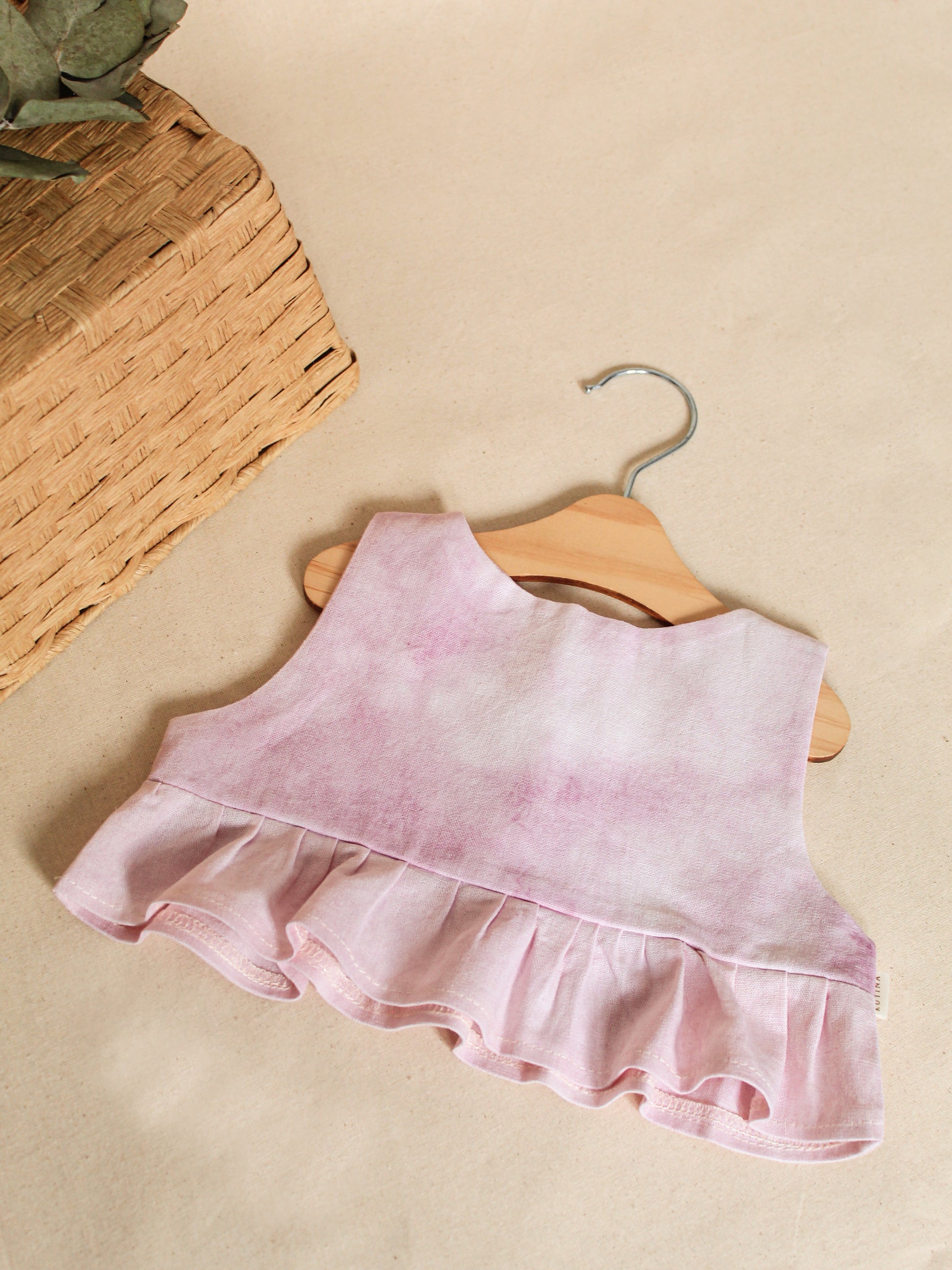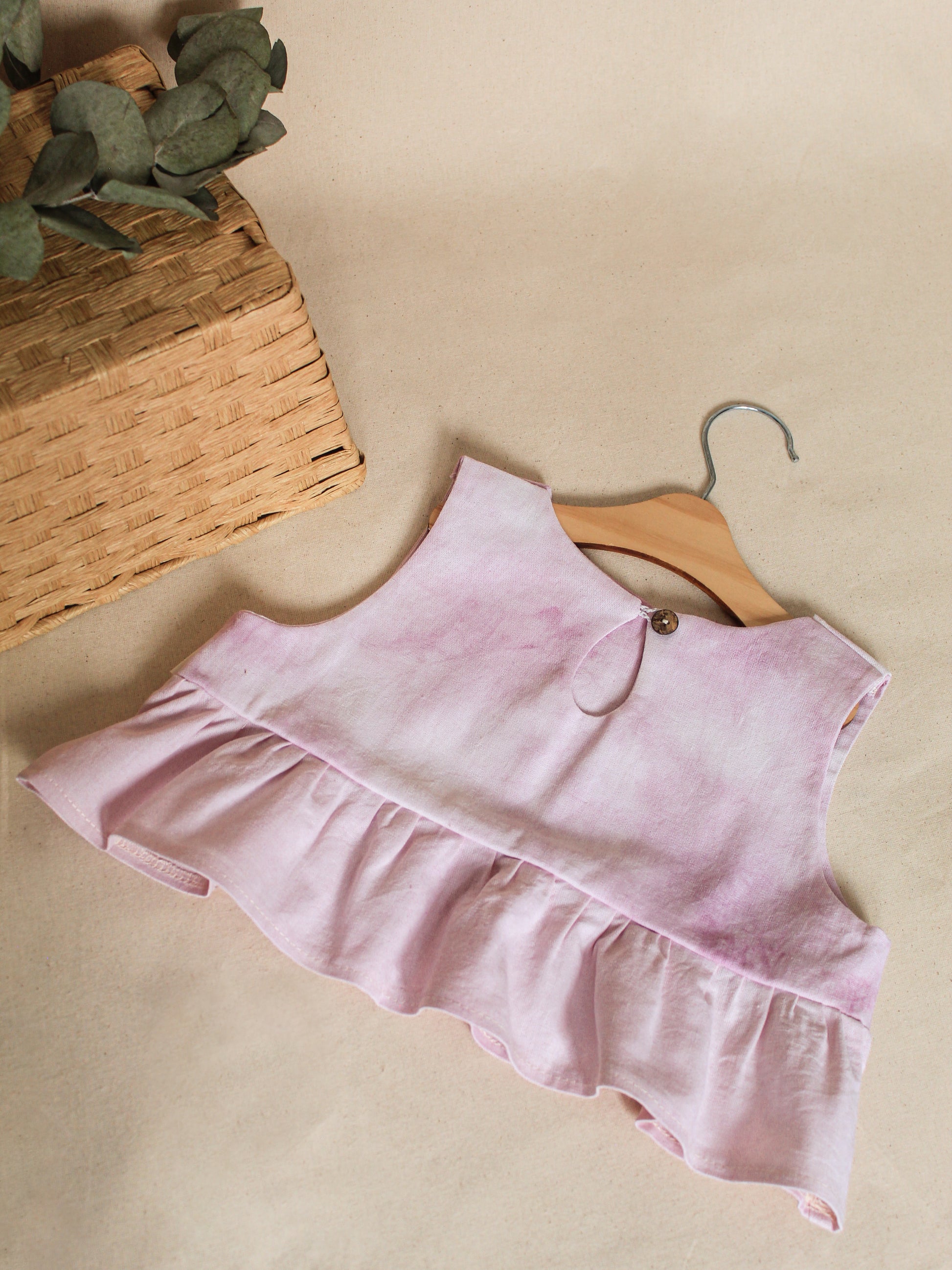 Confección detallada y a baja escala. Top con forro de lino y vuelo inferior, teñido artesanalmente con Cochinilla (tinte ancestral característico de américa), apertura en escote espalda.
