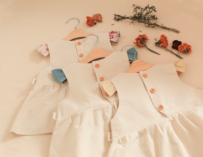 Textil algodón 100%, bolsillo central y vuelos teñidos con tintes naturales, botones de madera al reverso.